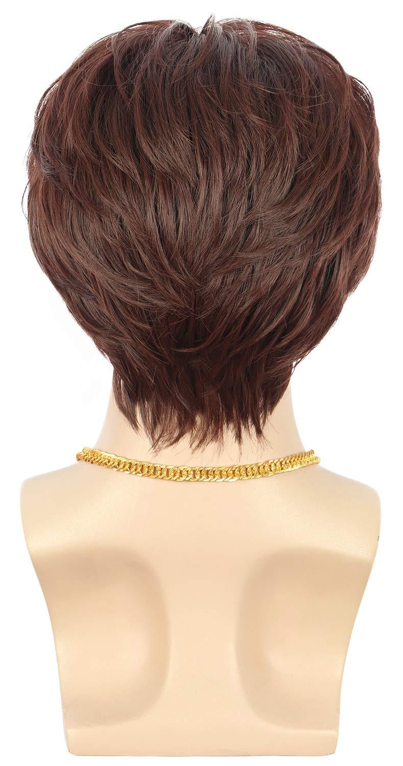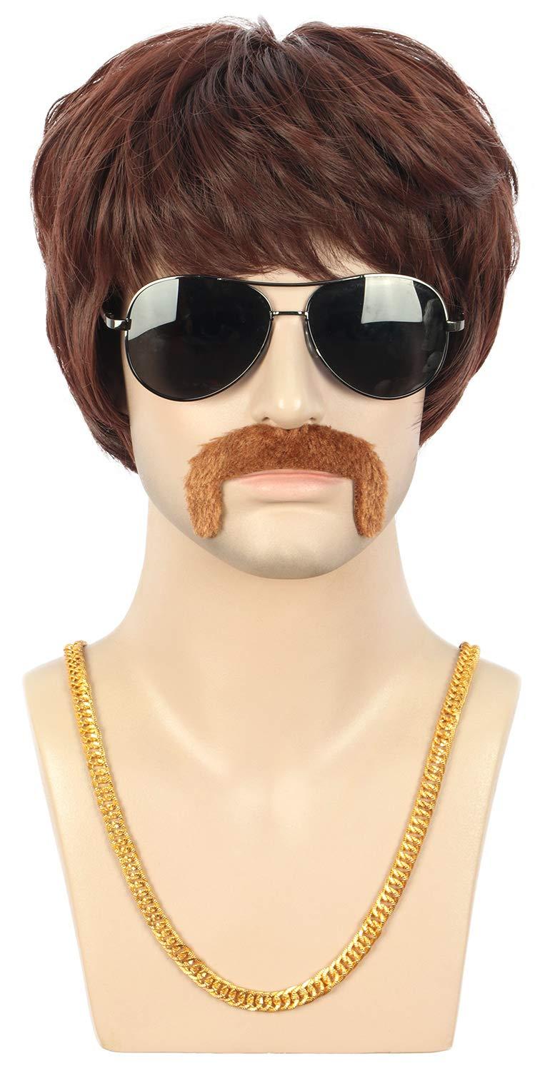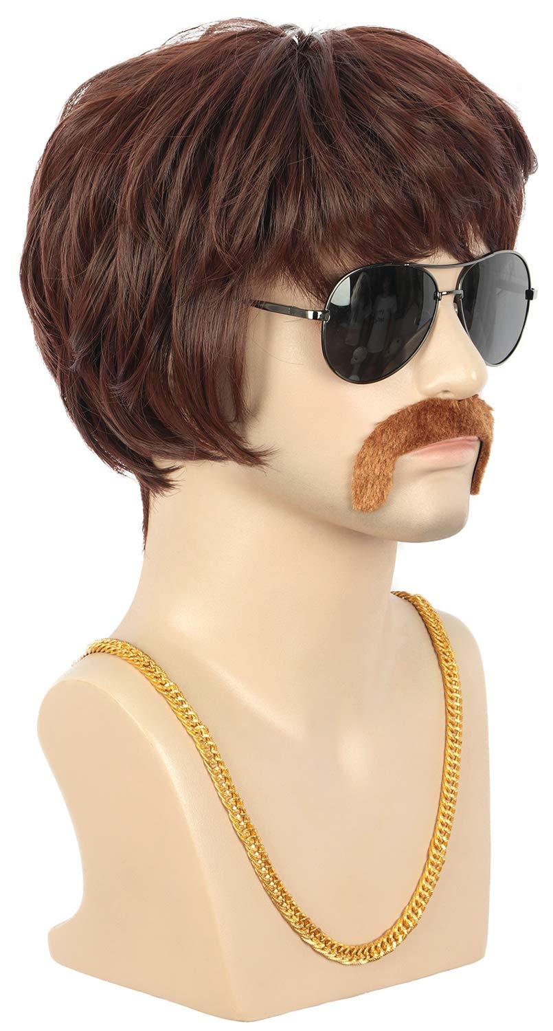 karlery Adult Men Short Straight Brown California 70s 80s Rocker Moustache Disco Wig with Necklace Halloween Costume Cosplay Anime Wig