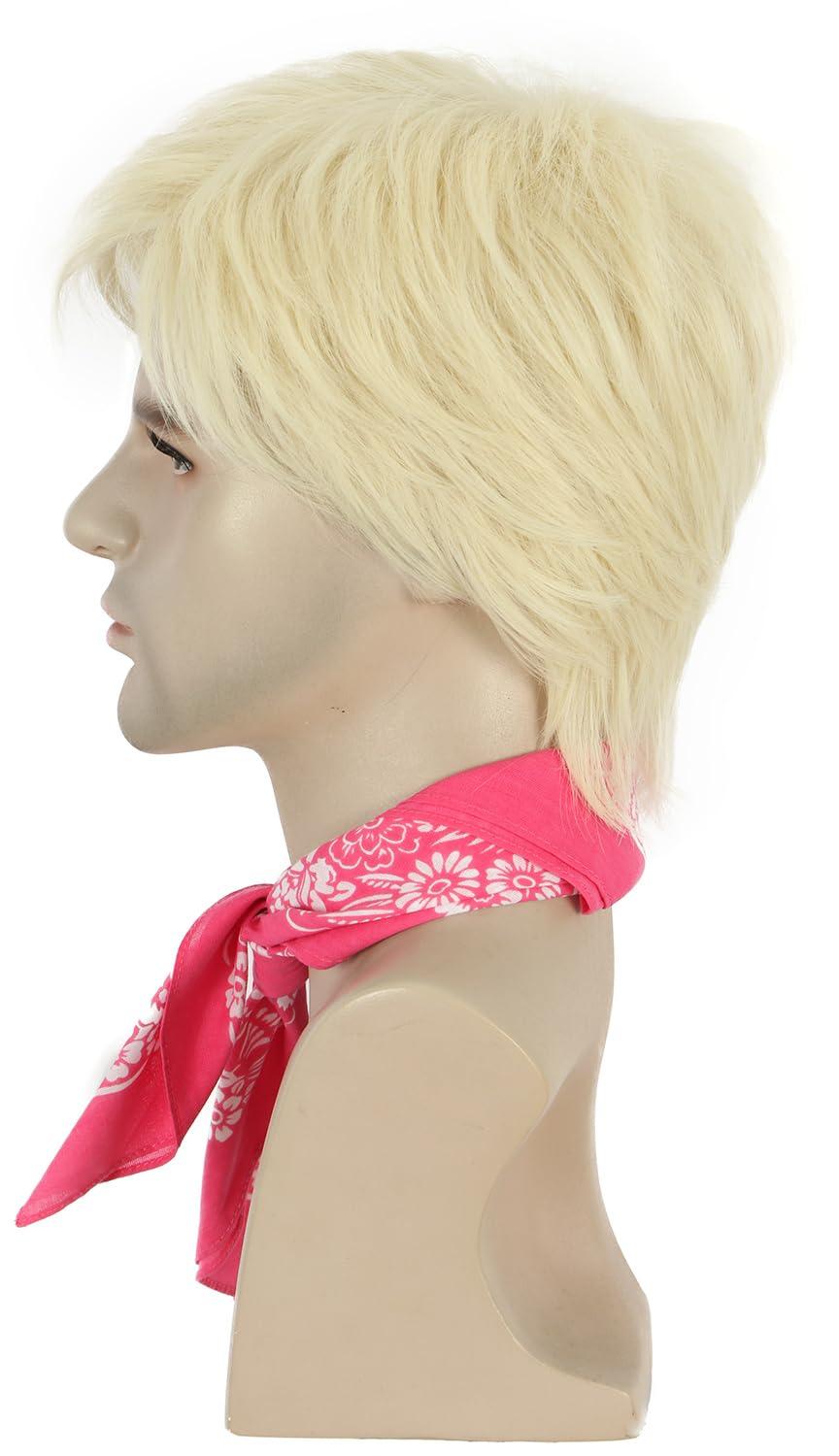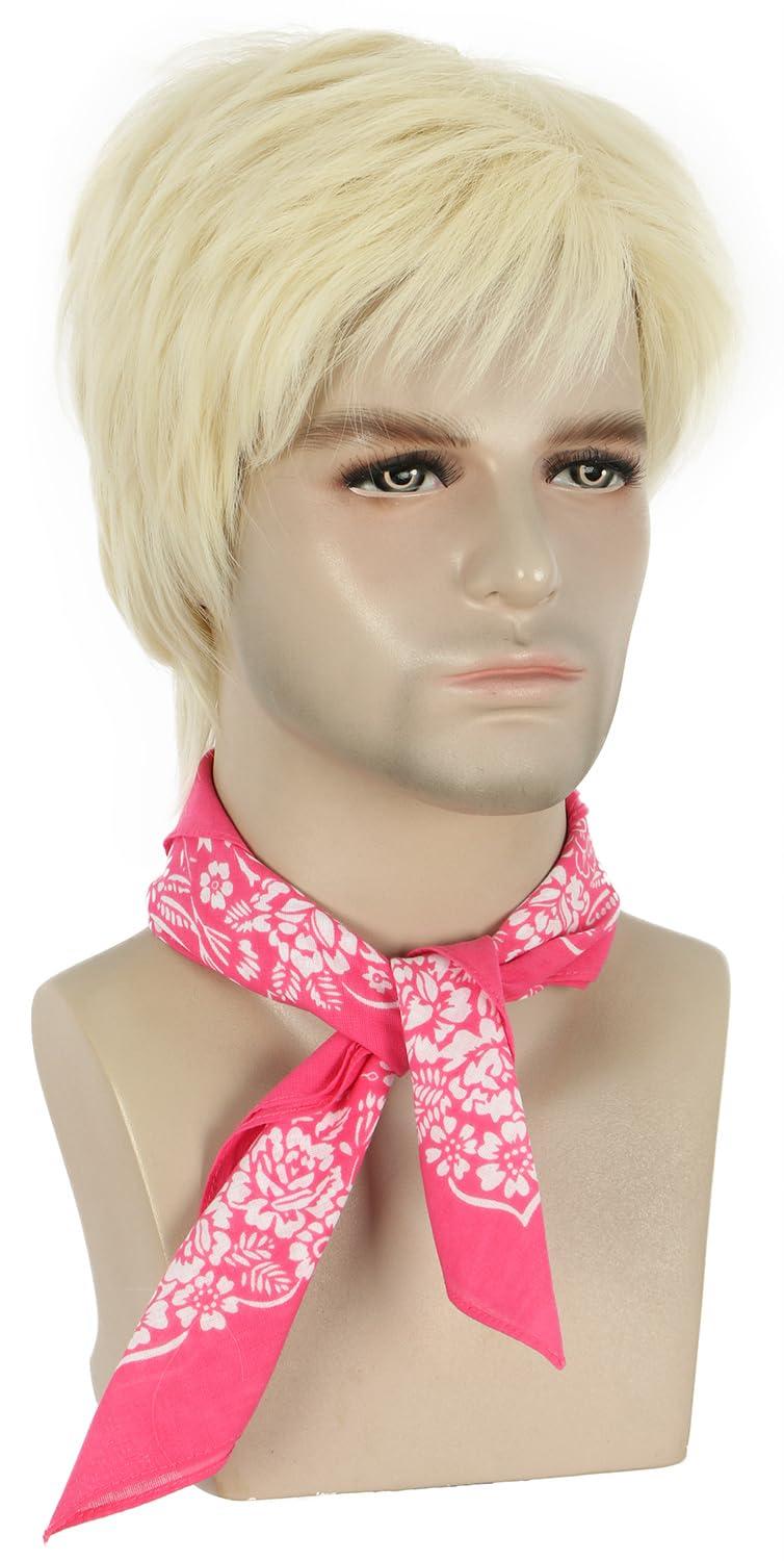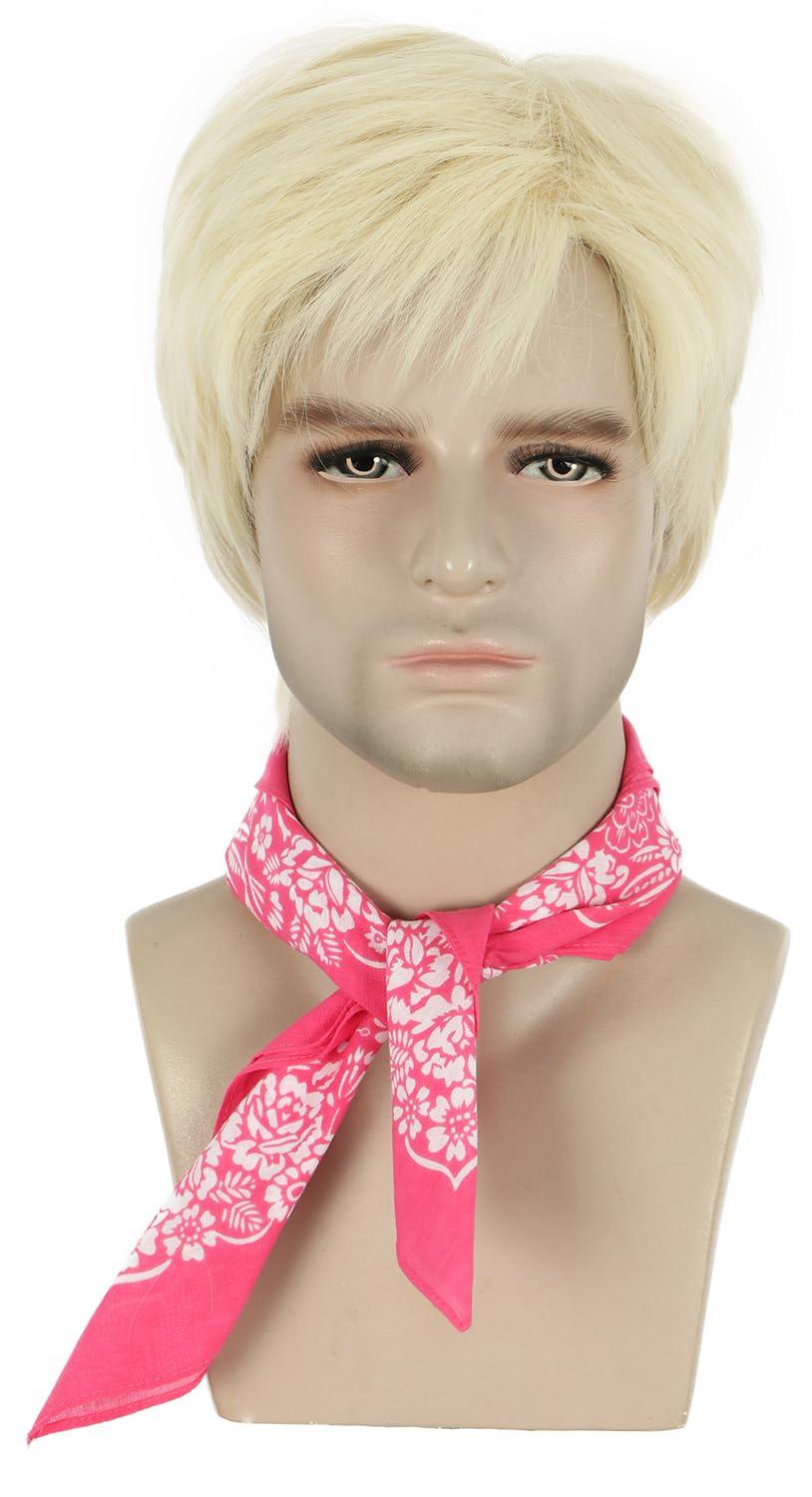 karlery Men Short Blonde Wig with Pink Bandana Natural Looking Daily Wig Halloween Cosplay Party Costume Wig