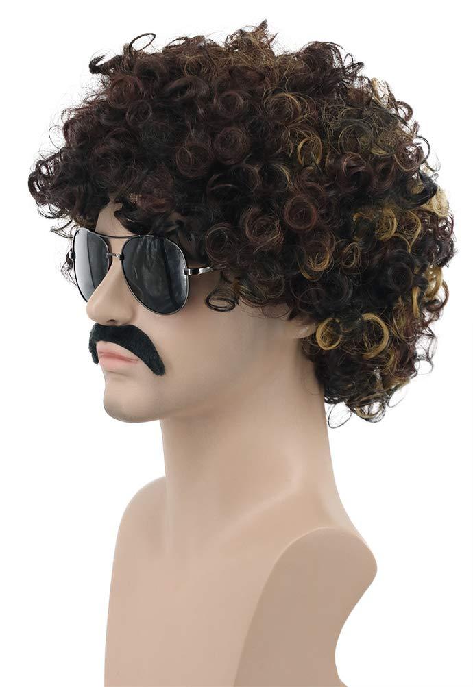 karlery Men Women Rocker Short Bob Curly Brown Gold Mustache Beard Disco Wig California Halloween Cosplay Afro Wig Anime Costume Party Wig(Brown)
